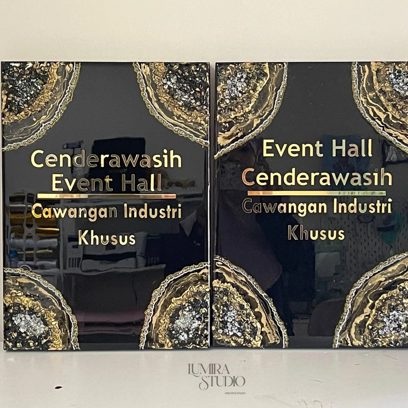 Designed with high-quality resin and intricate geode accents, this custom signboard adds a luxurious touch to any event space, office, boutique, or corporate environment. Featuring bold gold lettering and a glossy black background, each piece is personalized to match your branding or venue needs.